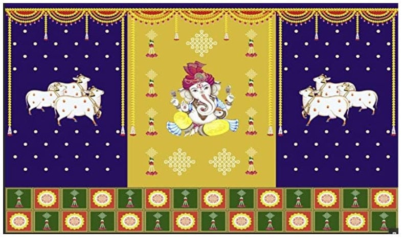 Cow with Ganesh Ji Backdrop Curtain for Decoration Backdrop Cloth for Pooja Decoration Traditional / Background Curtain Cloth for Pooja / Festival.... Fabric -- Polyester Taiwan Fabric... Size---5 height and 8 width(5*8)... Washable fabric